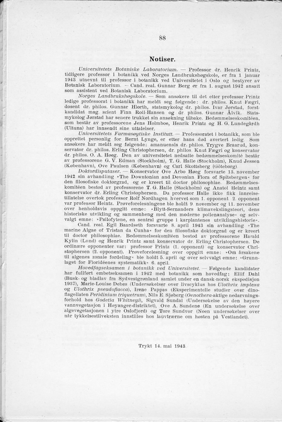 (anon.) 1943. Notiser. (Professoratet i botanikk ved Norges